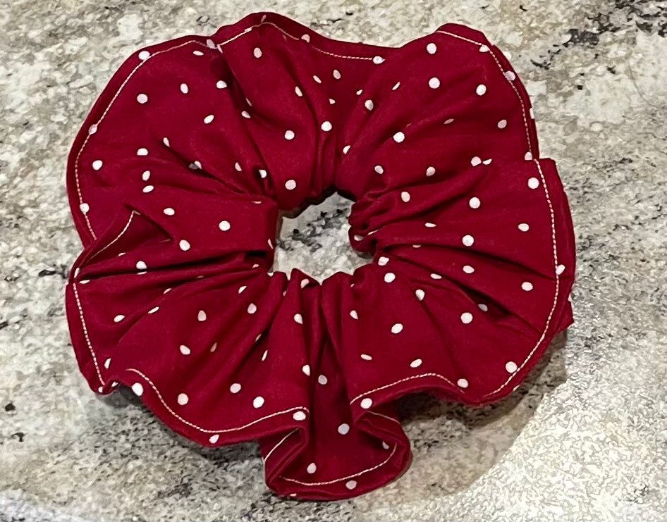 Charming Design: Our scrunchie features a playful red fabric adorned with white polka dots, perfect for adding a touch of fun and flair to any hairstyle. Whether you're heading to a casual brunch or dressing up for a special occasion, this scrunchie will keep you looking stylish and feeling confident.